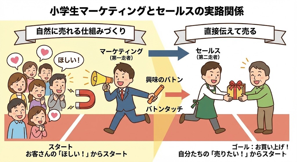 デパートに「ランドセルコーナー」ができるのは、学校に行く前のみんなを集めるマーケティングだね🎒 そこで「この色は人気だよ」とか「背負いやすいよ」とアドバイスしてくれるのがセールスだよ🤝 2つが協力して、みんなにぴったりのランドセルを届けているんだ✨