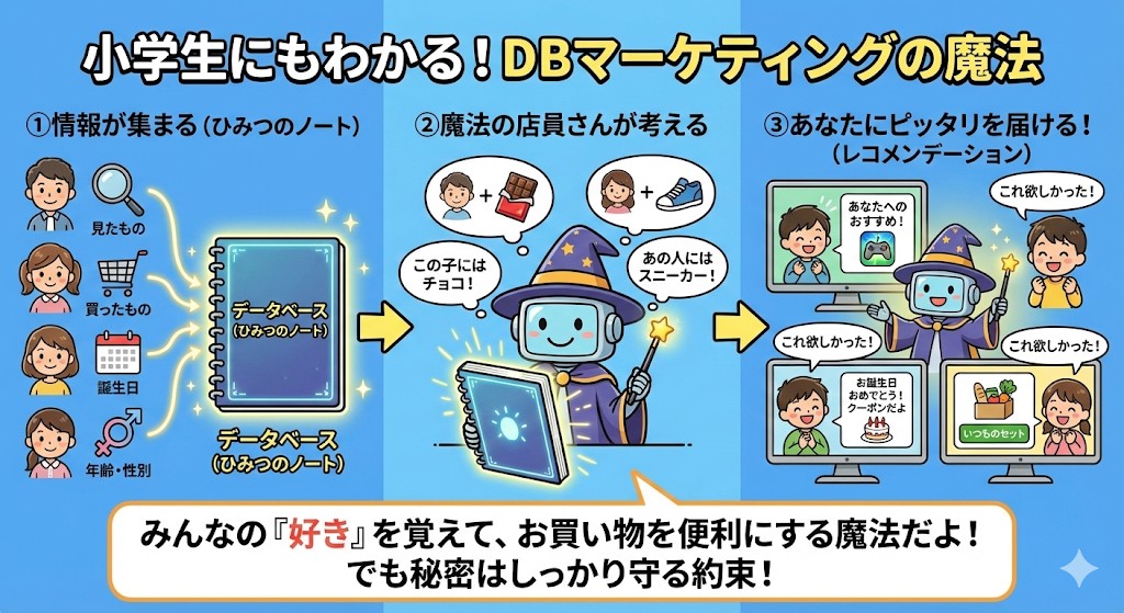 DBマーケティングは、みんなの「好き」を覚えて、お買い物を便利にするための魔法なんだね🙌