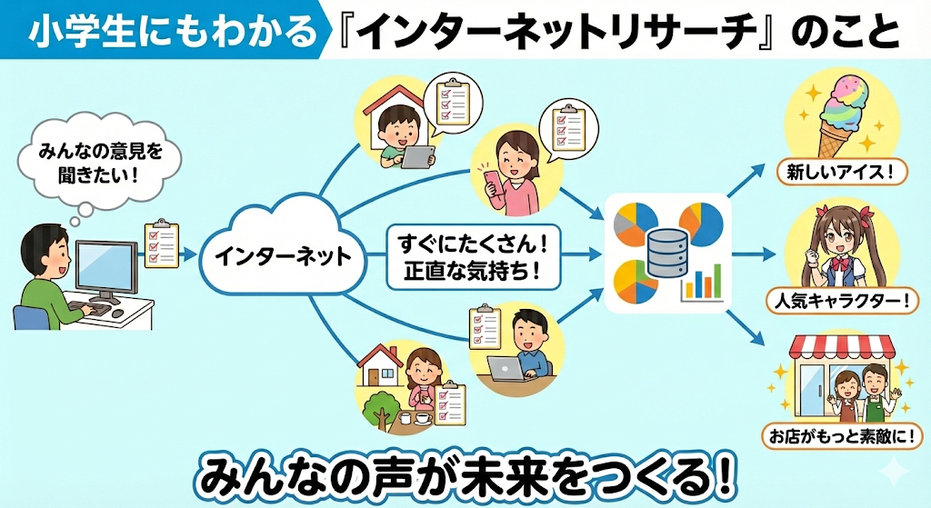 インターネットリサーチは、パソコンやスマホを使って、たくさんの人にアンケートに答えてもらう仕組みのことだよ✍️ 「みんなはどんなお菓子が好きかな?」とか「次の休みはどこに行きたい?」といった質問をネットで送って、みんなの意見をあつめるんだ😇