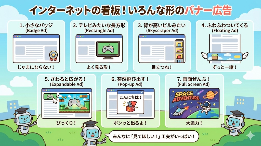 バナー広告には、バッジやビルみたいな形、突然飛び出す形など、いろいろな種類があることがわかったね 😊
