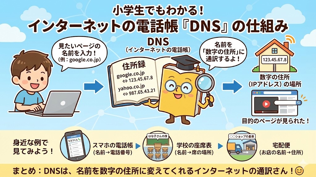 インターネットを使うときは、どこかでDNSという名前の「通訳さん」が頑張っていることを、ちょっと思い出してみてね📝
