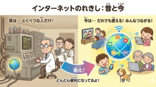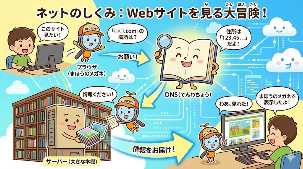 この記事では、WEBサイトが映し出されるまでの「秘密の通り道」や「情報の運び方」について、小学生のみなさんにもわかりやすく解説しますね