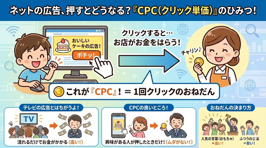 CPCは、インターネットの広告で「1回クリックされるたびにかかるお値段」のことだよ✍️
