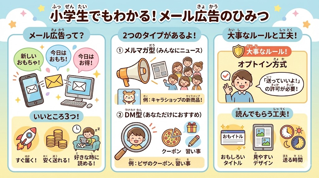 メール広告は、インターネットを使って直接みんなに情報を届けるとっても便利な方法だよ 😊