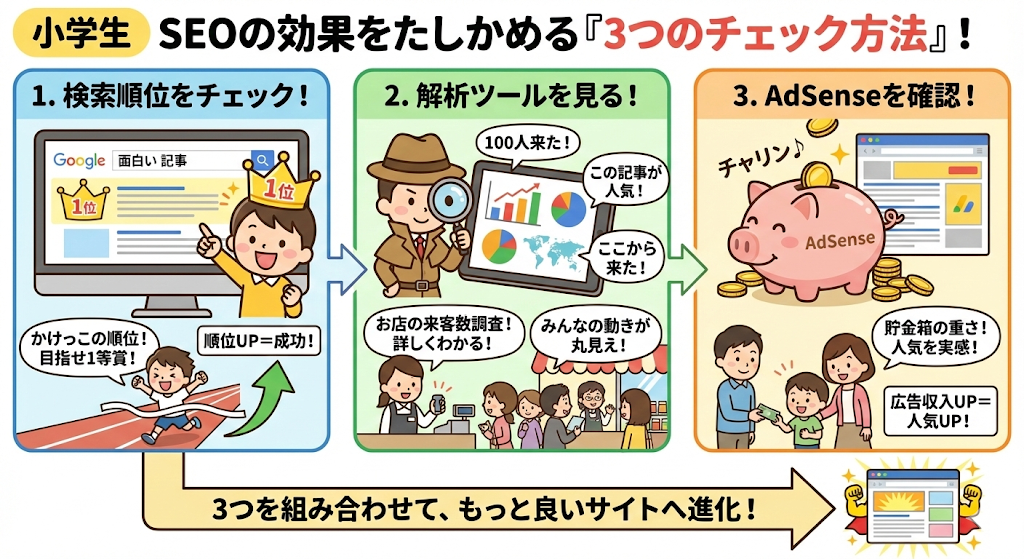 SEOの効果を確かめるには、「順位」で自分の順位を見て、「解析ツール」でみんなの動きを調べて、「アドセンス」で成果を実感するのがおすすめだよ🙌 この3つを使いこなせば、君のサイトはもっともっと素敵なものに進化していけるはずだよ😇 まずは自分のサイトが今何位か、こっそり調べてみることから始めてみてね✨