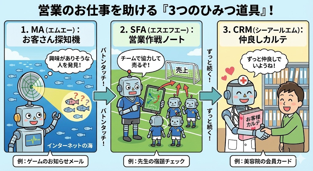 営業のお仕事を助ける「3つのひみつ道具」!MA・SFA・CRMってなに?✨