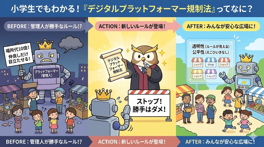 このように、場所を貸している強い立場の会社が、自分勝手なルールを作らないように見張るのが「デジタルプラットフォーマー規制法」なんです 😇