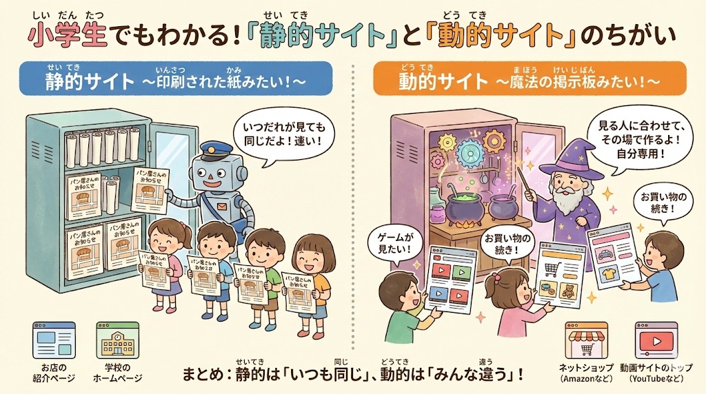 小学生でもわかる!「静的サイト」と「動的サイト」のちがい 🙌