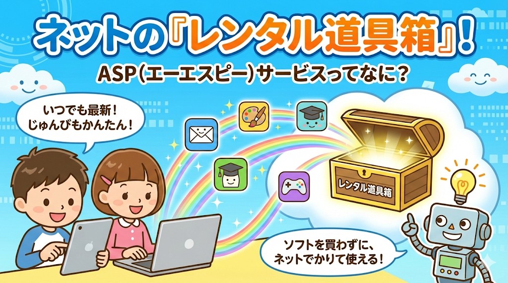 要点:ASPはインターネットを通じてソフトを「かりる」仕組みのことだよ