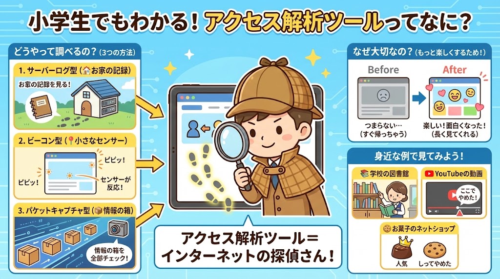 アクセス解析ツールは、ホームページに来てくれた人の動きを調べる、魔法の探偵道具です 😊