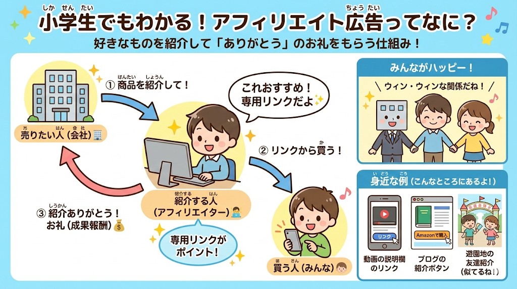 アフィリエイト広告は、自分の「好き」や「おすすめ」をみんなに伝えて、それが誰かの役に立ったときにお礼がもらえる素敵な仕組みだよ 😊