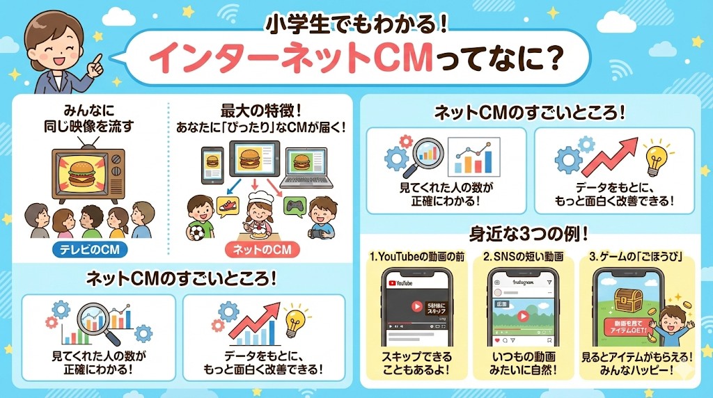 インターネットCMは、ただ動画を流しているだけじゃなくて、みんなが興味を持ちそうなものをピンポイントで見せるすごい技術が使われているんだ。 😇
