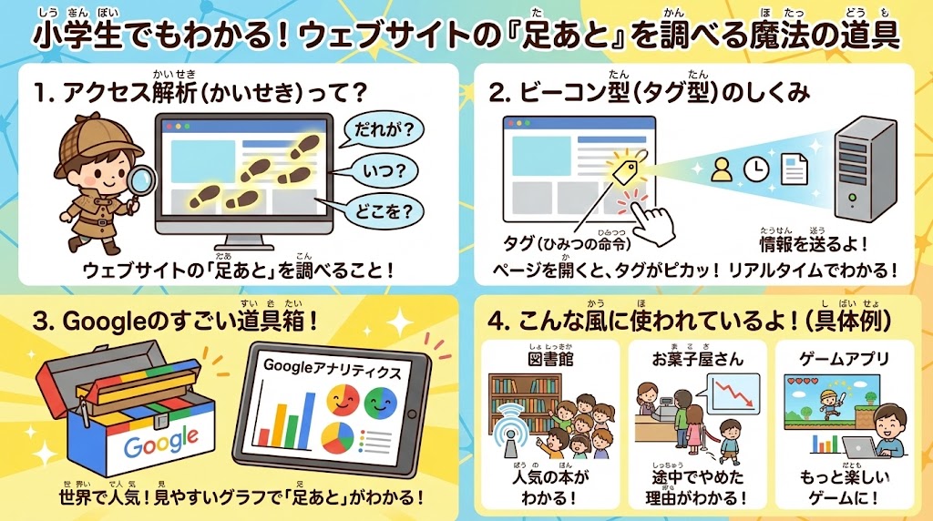 小学生でもわかる!ウェブサイトの「足あと」を調べるビーコン型とGoogleのすごい道具