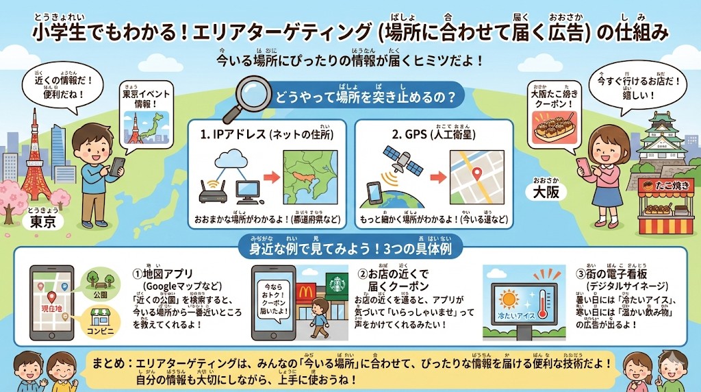 エリアターゲティングは、みなさんの「今いる場所」に合わせて、ぴったりな情報を届ける素晴らしい技術だよ 😊