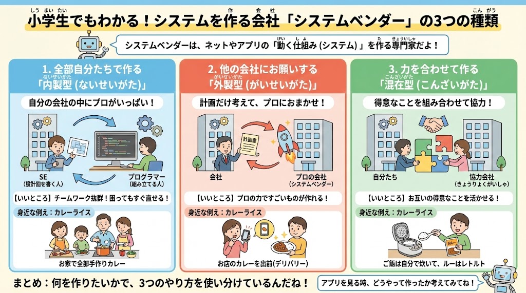 実は、システムベンダーには「作り方」によって3つのタイプがあるんだよ 😊