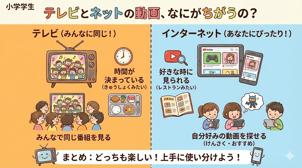 今日はテレビとインターネットの動画の違いについて、わかりやすくお話しするね 📝