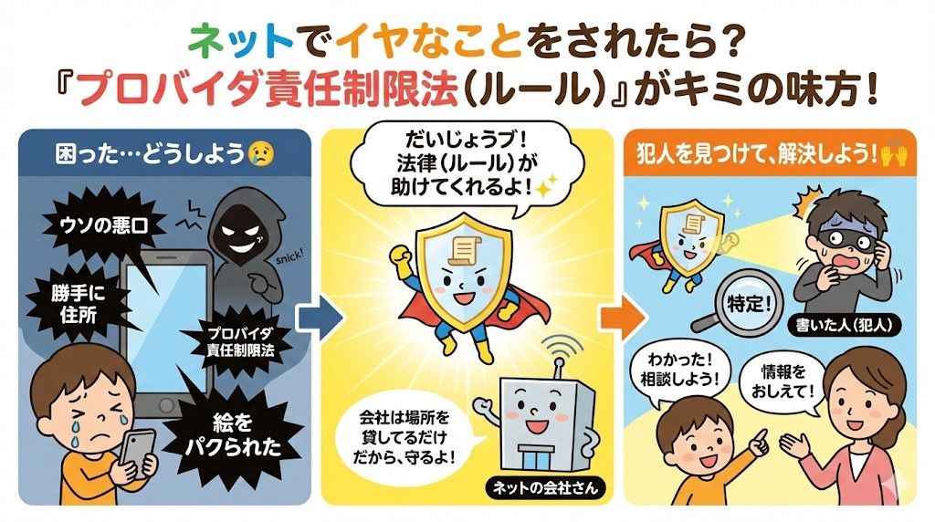プロバイダ責任制限法は、ネットの会社を守りながら、嫌なことをされた人を助けるための優しいルールなんだよ😊