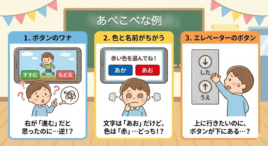 たとえば、画面の右側に「左にいく」というボタンがあったら、少しびっくりしちゃうよね