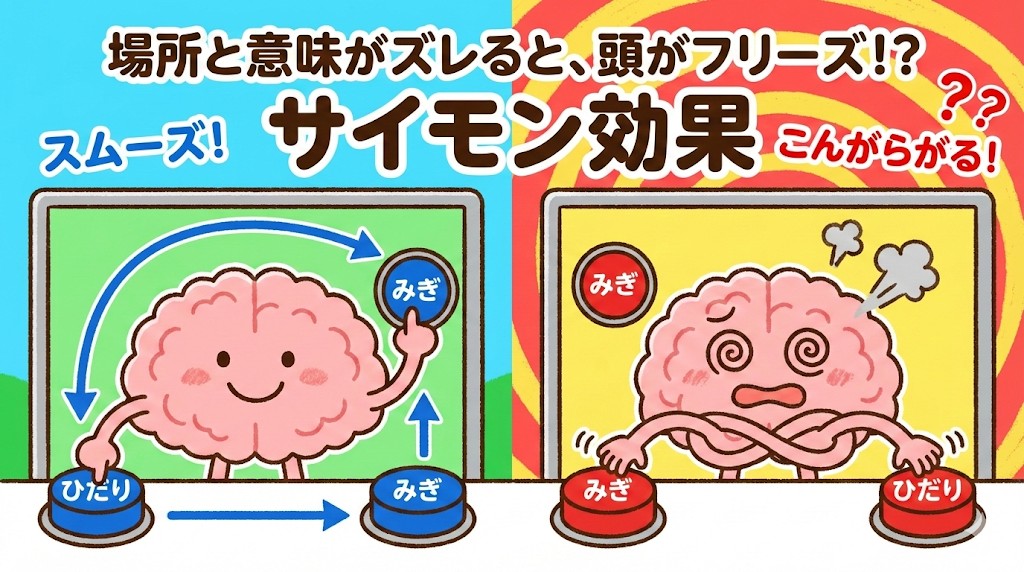 サイモン効果とは、ものの「場所」と「意味」がバラバラのときに、人間が混乱してしまう現象のことだよ