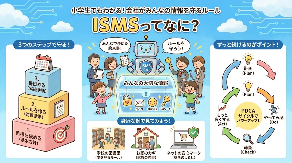 今回は、会社やお店が情報を守るために使っている「ISMS」というルールについて、わたしがわかりやすくお話しします😊