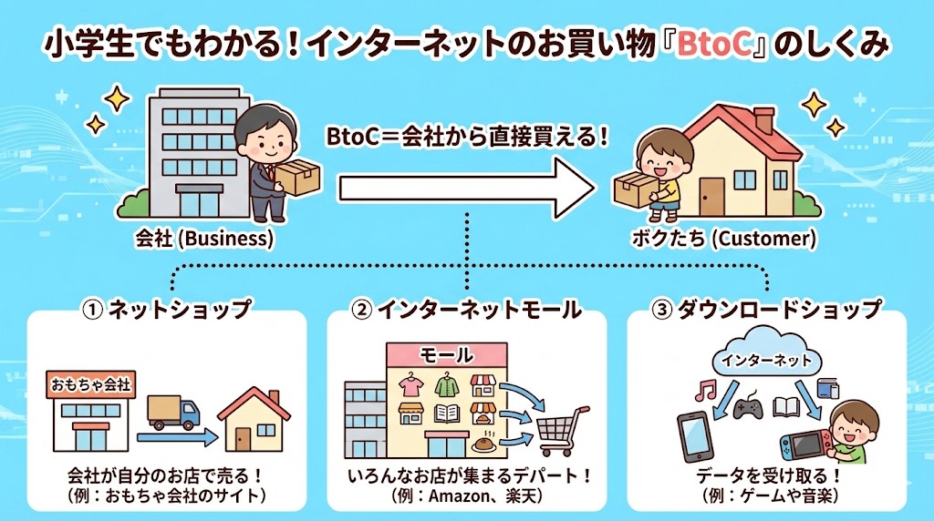 BtoCは会社がボクたちにモノを売る仕組みで、ネットショップやモール、ダウンロードといったいろいろな形があるんだね 😊