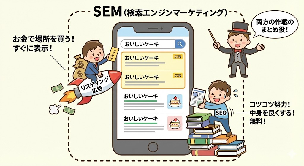 これは、「SEO」と「リスティング広告」を両方ひっくるめた、大きな作戦全体の名前なんだ🙌