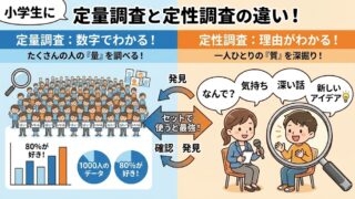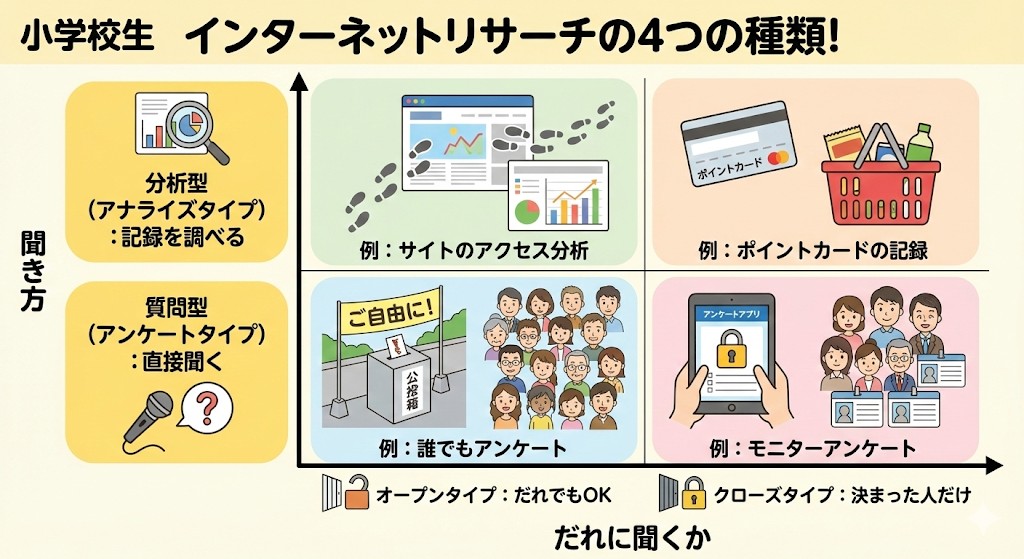 インターネットリサーチには、大きく分けて「どんな聞き方をするか」と「だれに聞くか」という2つの分類方法があるよ✍️ これらを組み合わせることで、知りたい情報を正確に集めることができるんだ😇