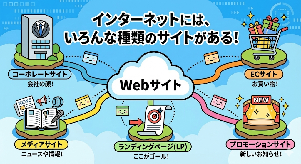 Webサイトには、会社の顔になるもの、お買い物をするもの、情報を伝えるものなど、たくさんの種類があります!🌈 自分がサイトを見る時に「これはどの種類のサイトかな?」と考えてみると、インターネットマーケティングがもっと楽しくなりますよ。✨