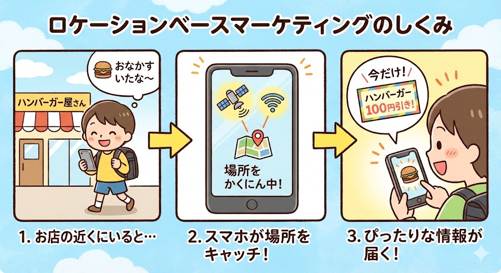たとえば、おなかがすいている時に、ちょうど目の前にあるハンバーガー屋さんのクーポンがスマホに届いたら、とってもうれしいですよね?🍔 このように、場所(ロケーション)をきっかけにした「おもてなし」のようなマーケティングのことなんです📝