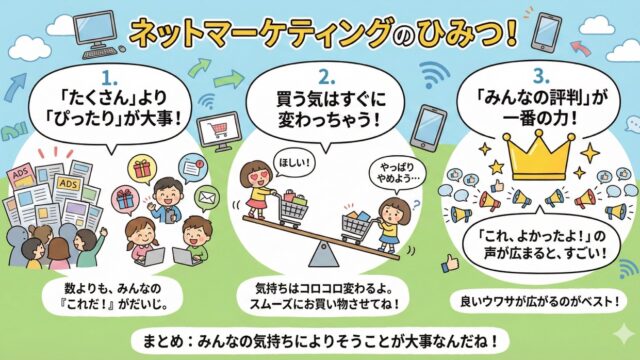 基礎理論 ネットマーケティングって何? 2026年2月12日 t_shinohara ネットマーケティングという言葉を聞くと、なんだか難しそうなイメージがありますよね。 でも、実は私たちがふだん使っているインターネットの世界で、とても大切なルールがあるんです😊 この …