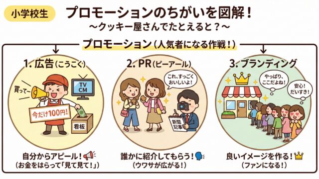 基礎理論 PR、広告、ブランディングのちがいとは? 2026年2月12日 t_shinohara プロモーション、PR、広告、ブランディング…どれも似ているようで、実は役割がぜんぜん違うんです。 小学生のみなさんにも分かるように、クラスでの出来事に例えて説明しますね😊 …
