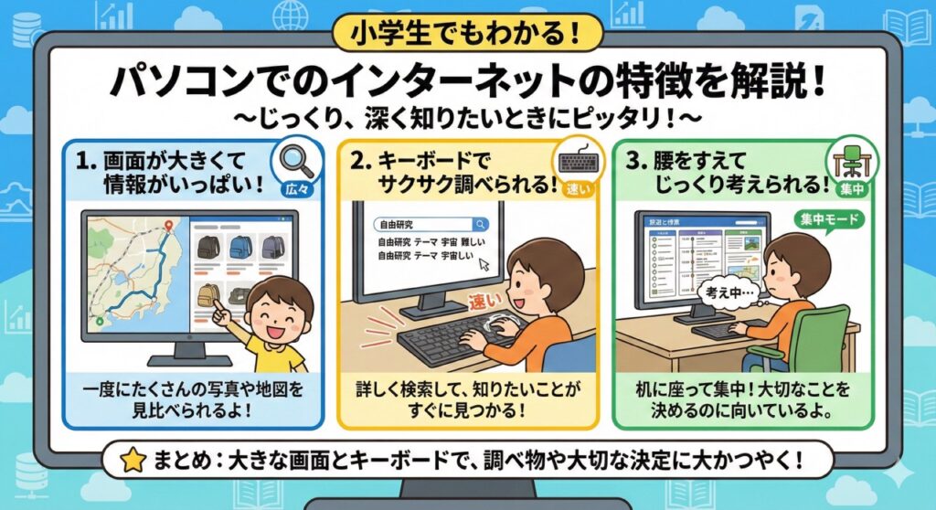 パソコンでのインターネットは、画面が大きくて入力がしやすいため、「じっくり深く調べたいとき」に最高の力を発揮します😊
