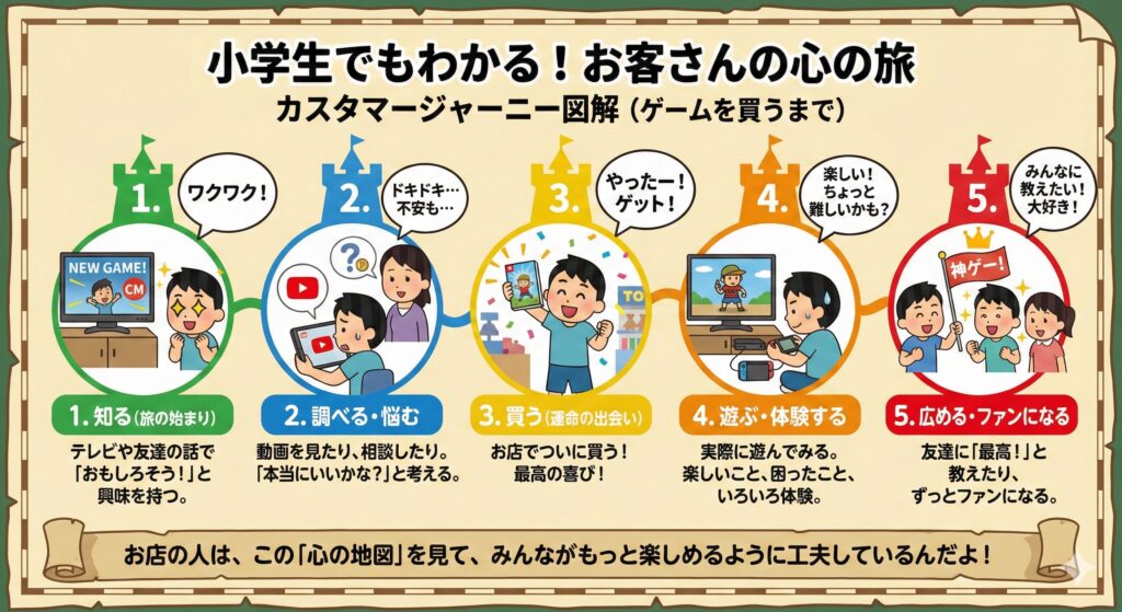こんなふうに、何かを知ってから、好きになって、使い続けるまでの、みんなの**「行動」と「心の動き(気持ち)」の移り変わり**。 これを、まるで長い旅行のように例えて**「カスタマージャーニー(お客さんの旅)」**と呼びます😊