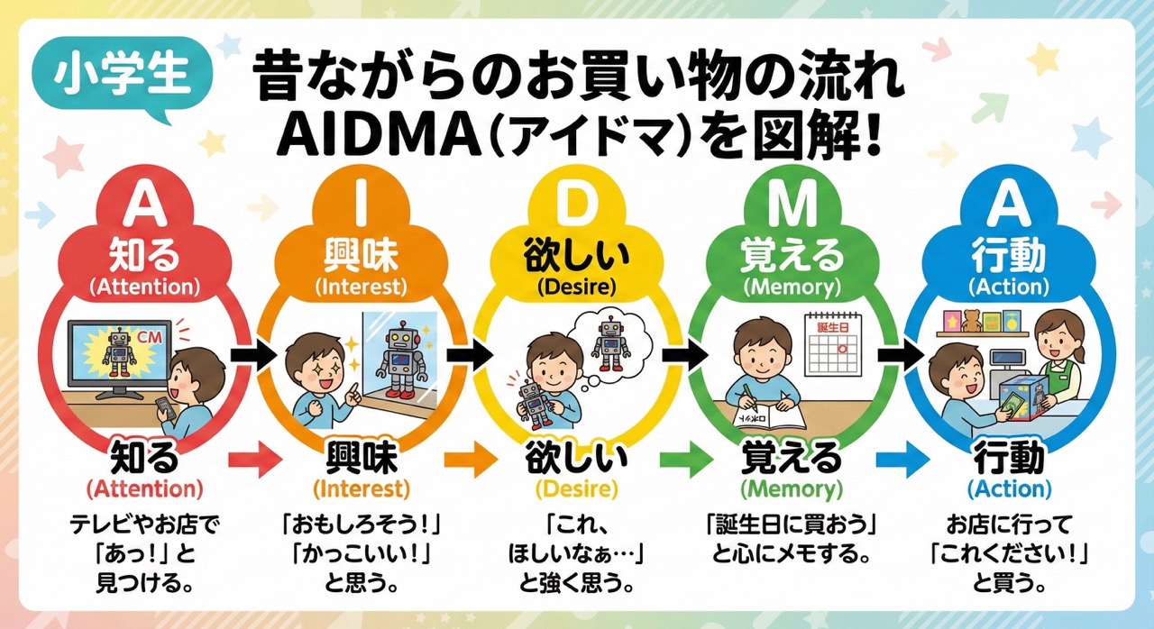 ネットでお買い物をするとき、みんなはどんなふうに決めていますか? 実は、人が何かを見つけてから「これ買おう!」と決めて、そのあと誰かに教えるまでには、決まった心の動きがあるんです😊 これを難しい言葉で「消費者行動理論(しょうひしゃこうどうりろん)」と言います。 今回は、インターネットの世界で特に大切な3つの心の動きについて、分かりやすく説明しますね✍️