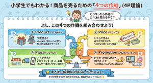 これは、お店の人が「どうやったら商品がたくさん売れるかな?」と考えたときに使う、4つの大切なポイントのことです 。英語の頭文字(かしらもじ)が全部「P」で始まるので、「4P(ヨンピー)」と呼ばれています 。 商品を売るための「4つの作戦」だと考えてみてください。