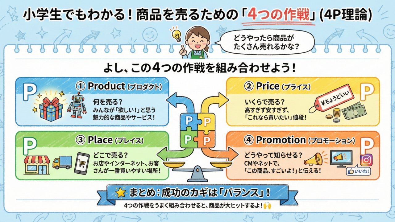 4P理論とは、この4つをうまく組み合わせて、「何を、いくらで、どこで、どうやって売るか」をバランスよく考えることです 。 インターネットの世界でも、この4つの作戦をしっかり立てることで、商品はもっと売れるようになります 😊✍️