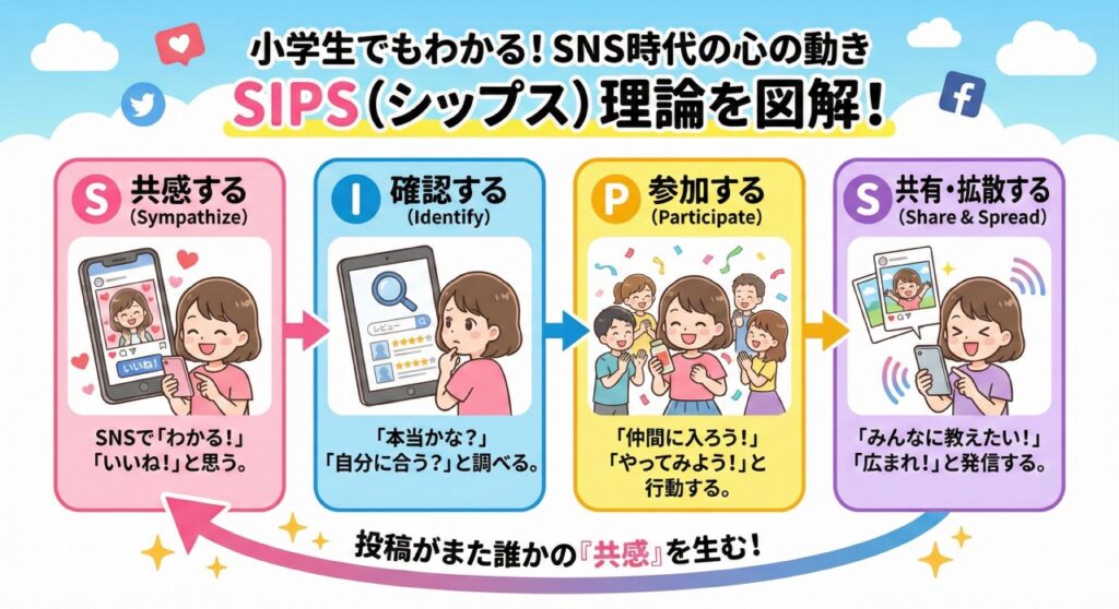 SIPS理論は、「共感」からスタートして、みんなで「参加」して盛り上がり、それを「広める」ことで、また新しい「共感」を生む、という流れのことです📝 みんなが普段SNSで何気なくやっている「いいね!」や投稿も、実はこのSIPSの動きの一部になっているかもしれませんね😊