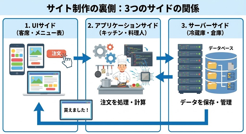 Webサイトやサービスを開発する側(制作者側)から見たとき、システムは大きく3つの「サイド(階層)」に分かれています。